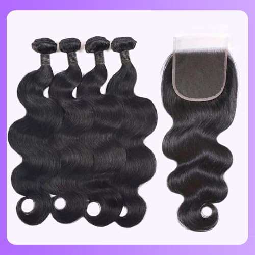 Body Wave Bundles with Closure Human Hair 18 20 22 24 + 16 Inch Brazilian Human Hair 3 Bundles with 4x4 HD Lace Closure Part 12A Grade 100% Unprocessed Virgin Hair