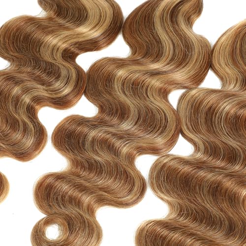 Seekomi Ombre 4/27 Body Wave Bundles Human Hair 14 16 18 20 Inch 12A 100% Virgin Highlight Colored Brown and Blonde 4 Bundles Double Weft Quick Weave for Women, 400g